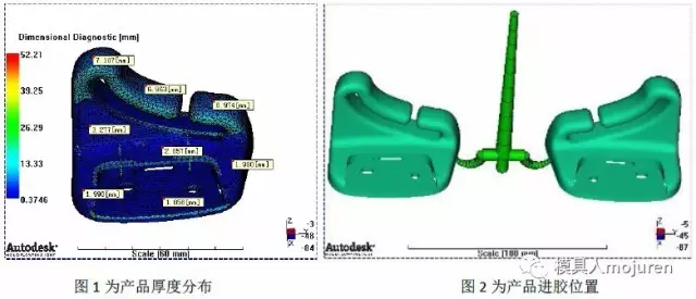 此產(chǎn)品為汽車安全帶固定件: 產(chǎn)品最大外形尺寸:70*45*63,產(chǎn)品平均肉厚:1.8~7.0mm,產(chǎn)品肉厚差異較大,因此采用3D網(wǎng)格分析,如圖1所示。材料:ABS+PA6-GF8 Terblend N NG-02 : BASF .此材料已做修正,質量指示器為銀級,此材料可信度較高。 模具為一模兩件,由于產(chǎn)品量大,因此進膠方式為冷流道隧道澆口進膠,如圖2所示。