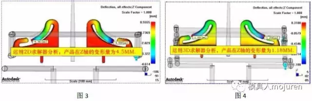 此產(chǎn)品雖有拐角,但不可使用雙層面網(wǎng)格含有拐角效應的選項進行分析,由于此產(chǎn)品的形狀、壁厚分部不均且壁厚變化較大已不符合使用雙層面網(wǎng)格的要求(在這里我用雙層面網(wǎng)格分析了一下,如圖3所示。分析出的變形高達4.5MM),因此采用3D網(wǎng)格分析,分析出來的產(chǎn)品最大變形為1.18MM,如圖4所示。